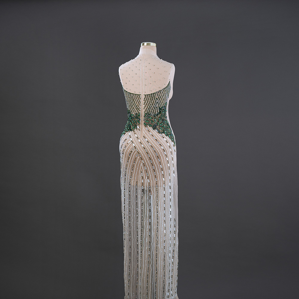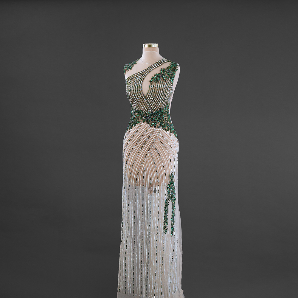 پنل لباس مجلسی سبز از تور کارشده جلو و پشت ساخته شده و مانند اکثر پنلهای برند یوسف الجسمی: